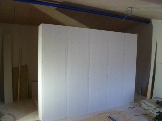 De wanden zijn gemaakt van houtskelet. Het plafond is verlaagd en voorzien van isolatiemateriaal. Wanden en plafonds zijn vervolgens gestuukt. Achter de wand van het bed is een nis gemaakt. Deze is voorzien van steigerhouten planken.